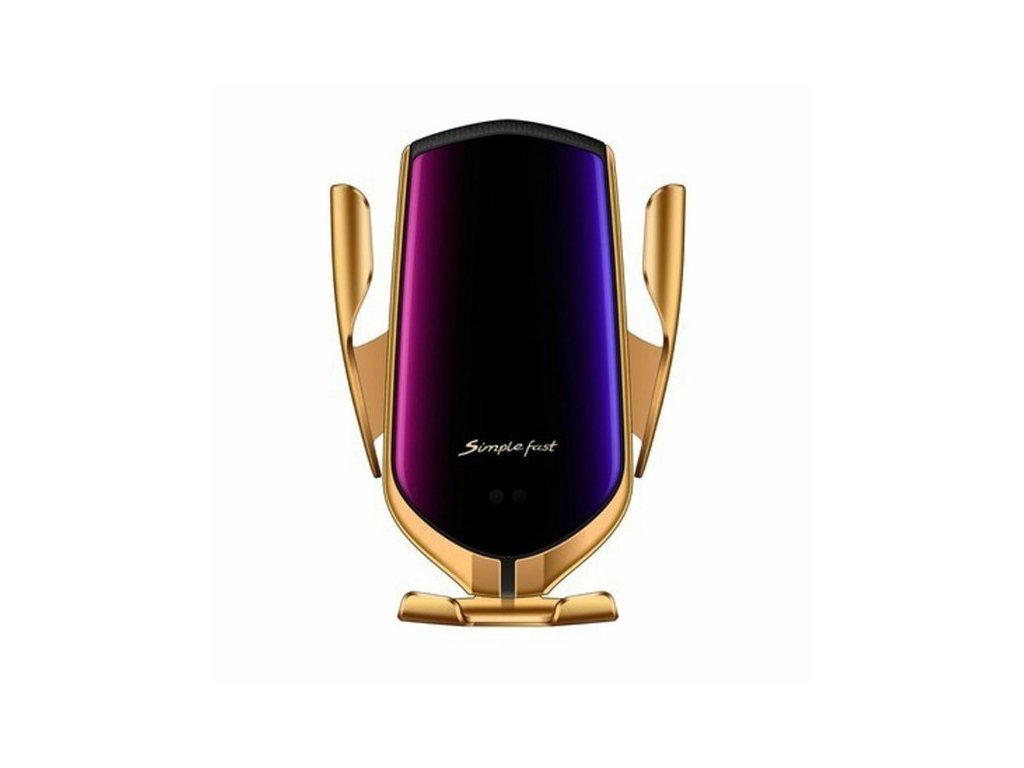 Univerzálny držiak do vetracej mriežky do auta s optickým senzorom pre bezdotykové uchytenie telefónu as bezdrôtovým Qi nabíjaním. Bezdrôtová nabíjacia stanica do auta umožňuje rýchle bezdrôtové nabíjanie bez obťažujúcich káblov. Jej elegantný tvar dodá šarm interiéru vášho vozidla. Držiak je vybavený infračerveným senzorom a automaticky obopne Váš telefón, akonáhle ho vložíte, čo umožňuje jednoduché ovládanie jednou rukou a zvýši to tak Vašu bezpečnosť pri šoférovaní. Držiak je vyrobený z plastu a povrch má v zlatej farbe. Vnútri nabíjačky je zabudovaný prídavný protišmykový systém, ktorý pri jazde po menej spevnených cestách, keď sú vibrácie vyššie, zaistí väčšiu priľnavosť.